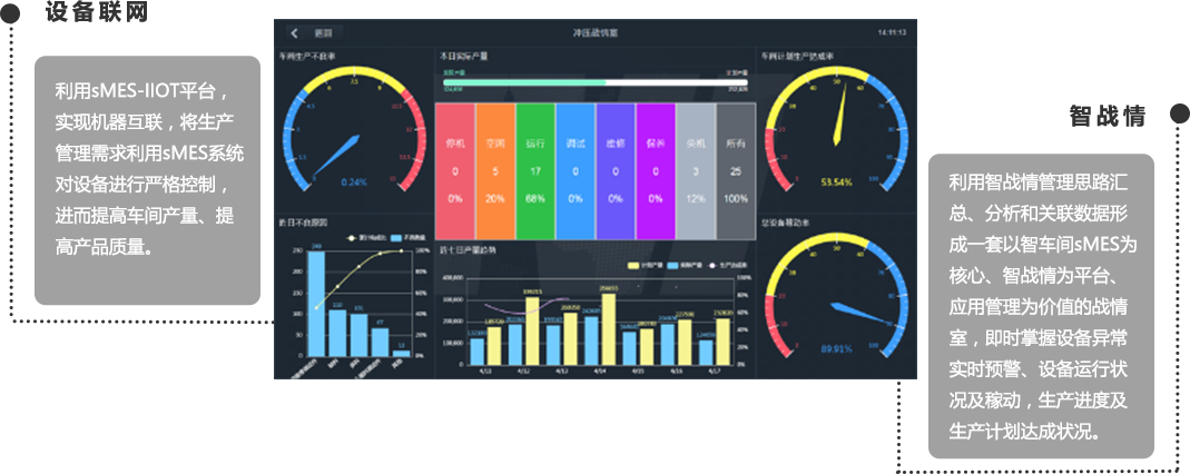 利用智戰(zhàn)情管理思路匯總、分析和關(guān)聯(lián)數(shù)據(jù)形成一套以智車間sMES為核心、智戰(zhàn)情為平臺(tái)、應(yīng)用管理為價(jià)值的戰(zhàn)情室,即時(shí)掌握設(shè)備異常實(shí)時(shí)預(yù)警、設(shè)備運(yùn)行狀況及稼動(dòng),生產(chǎn)進(jìn)度及生產(chǎn)計(jì)劃達(dá)成狀況。