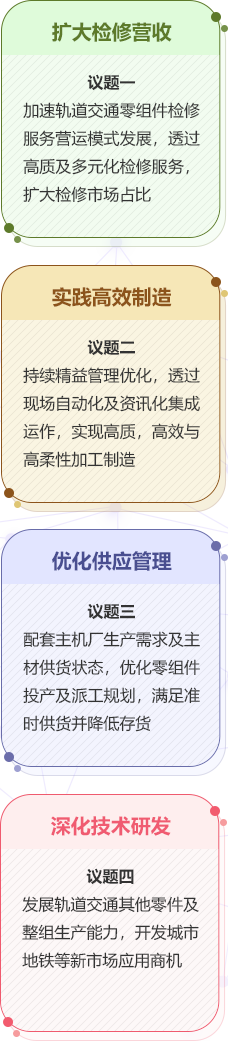 加速軌道交通零組件檢修服務營運模式發(fā)展,透過高質及多元化檢修服務,擴大檢修市場占比