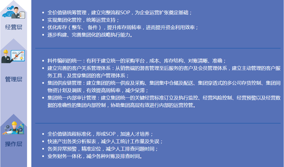 - 整合集團多品牌業(yè)務(wù)流程,制定集團統(tǒng)一管理的規(guī)則,實現(xiàn)銷售與售后數(shù)據(jù)快速無縫的傳遞,提升企業(yè)資源集中共享的能力。