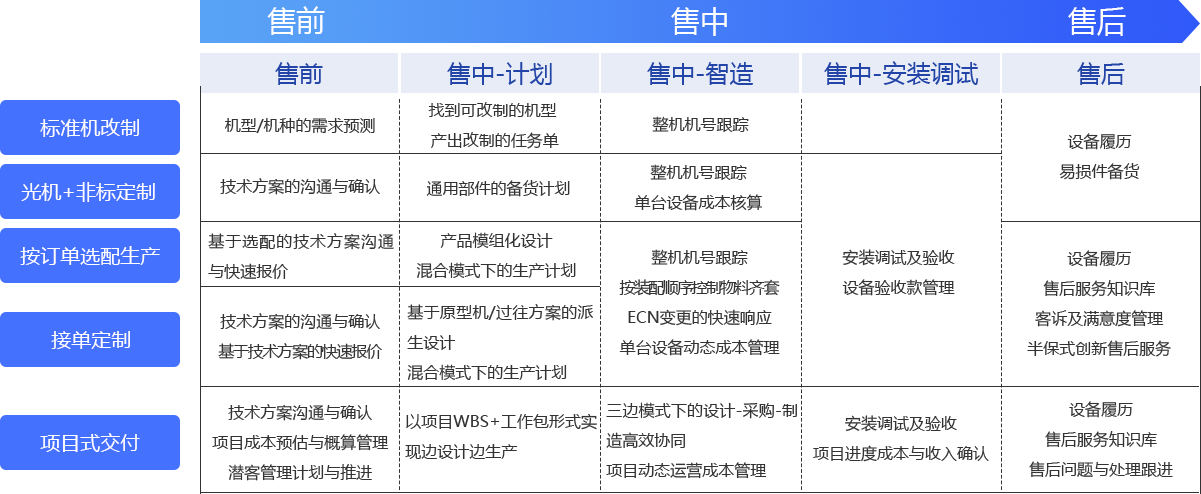 從銷售、項目、設計、計劃、供應鏈、生產、安裝調試到售后服務,形成企業(yè)全流程、全價值鏈、全生命周期的數(shù)智化管理,用數(shù)智驅動的思維解決經營管理中的不確定性問題。