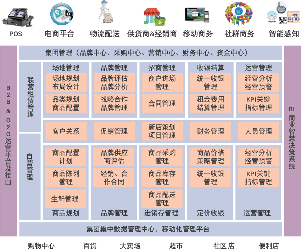 鼎捷綜合零售全渠道解決方案,透過(guò)集團(tuán)數(shù)據(jù)管理中心以及集團(tuán)5大運(yùn)營(yíng)管理中心架構(gòu),搭配不同經(jīng)營(yíng)模式的管理流程組合,完成企業(yè)多行業(yè)經(jīng)營(yíng)數(shù)據(jù)與管理流程共享目標(biāo),同時(shí)結(jié)合B2B供應(yīng)商平臺(tái)與O2O運(yùn)營(yíng)平臺(tái)及互聯(lián)中臺(tái),為企業(yè)打造統(tǒng)一的數(shù)據(jù)化管理平臺(tái)。協(xié)同BI商業(yè)智慧決策系統(tǒng)的大數(shù)據(jù)分析能力,為企業(yè)搭建智能化決策管理平臺(tái)。