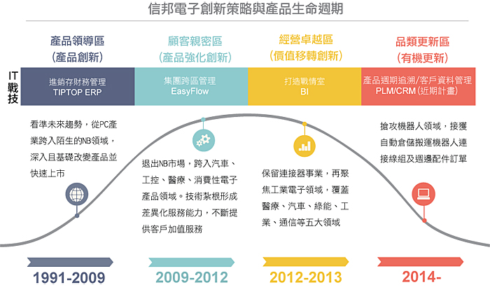 全球高科技策略大師─傑佛瑞.摩爾(Geoffrey Moore)於《企業(yè)達(dá)爾文》一書中提到:「成功企業(yè)面對(duì)最大陷阱就是被過去成功綁架,成熟公司一定會(huì)碰到成長(zhǎng)極限嗎?」膽大心細(xì)的信邦,在對(duì)的時(shí)間做對(duì)的事,將創(chuàng)新策略與產(chǎn)品生命週期完美結(jié)合,快速準(zhǔn)確地鎖定市場(chǎng),追求逐步穩(wěn)定成長(zhǎng)。除了核心事業(yè),也將資源分配至研發(fā)新領(lǐng)域,藉此提升公司力,拉到新的軌道,爭(zhēng)取公司最佳利潤(rùn)。這更是為什麼客戶離不開,指定服務(wù)的原因之一。