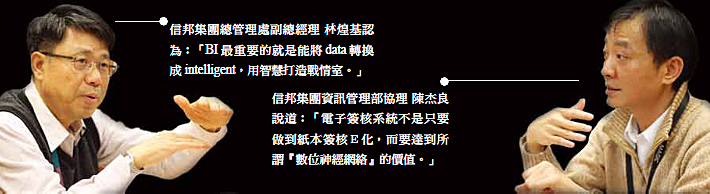 信邦集團(tuán)總管理處副總經(jīng)理 林煌基(以下簡(jiǎn)稱 林副總經(jīng)理)表示:「若要將ERP發(fā)揮最大價(jià)值,企業(yè)必需要推動(dòng)BPR(企業(yè)流程再造)。BI最重要的就是能將Data轉(zhuǎn)換為Information、Knowledge,最後變成Intelligent。」切割BU授權(quán)分流,再輔以BI智慧打造戰(zhàn)情室,讓各階層人員都知到目前的狀況: