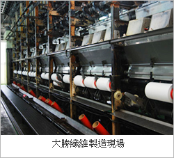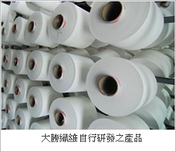 大勝纖維是空氣加工絲(Air Textared Yarn)生產專業(yè)假橪廠,設立於民國85年位於斗六工業(yè)區(qū)。使用人造纖維(尼龍、聚酯纖維、聚丙烯PP纖維)等原料,經由空氣特殊加工製程,使人造長纖維達到仿天然棉的手感、觸感、光感舒適等特性。大勝纖維為配合市場日益增加的少量多樣化的需求,大勝纖維開發(fā)變化十足性與服務機動性快速性,並由研發(fā)單位機動、快速地開發(fā)新產品與客戶共同開拓商機。使用自行生產的仿棉絲,空氣織機,劍桅織機生產平織,提花,彈性A.T.T尼龍高強力、聚酯高強力朝高科技機能性產品生產,達到休閒性、運動性、舒適性和自然性,秉持用心、品質第一、創(chuàng)新和客戶創(chuàng)造雙贏的成長空間。