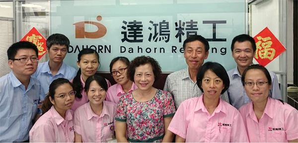 (感謝《達(dá)鴻精工》接受鼎新電腦專訪。由左到右:前排_(tái)業(yè)務(wù)、現(xiàn)場生管、倪副總、研發(fā)主管楊小姐、生管楊小姐;後排_(tái)現(xiàn)場主管吳先生、研發(fā)、採購、會(huì)計(jì)李小姐、楊董事長、鼎新顧問鄭順文)