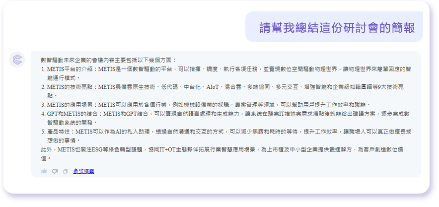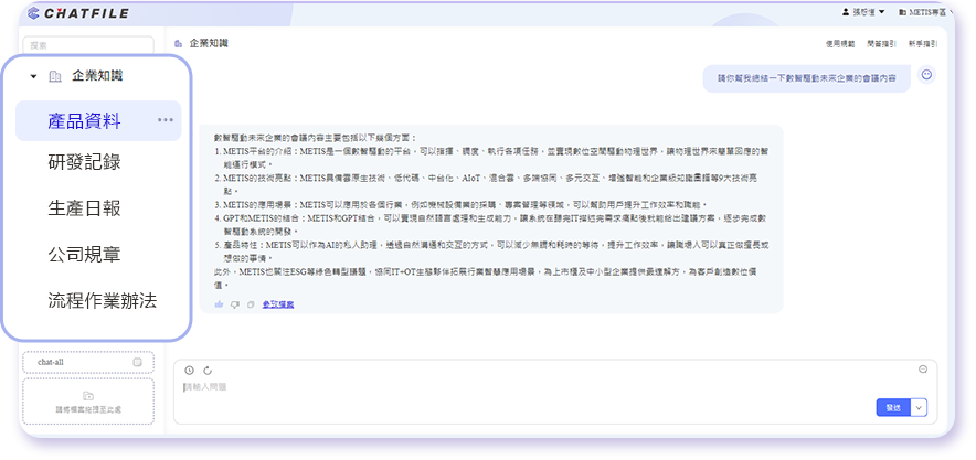 ChatFile是透過(guò)鼎新METIS平臺(tái)的文件解析技術(shù),所為企業(yè)建構(gòu)的一個(gè)新型態(tài)的知識(shí)管理平臺(tái)(KMS),結(jié)合了微軟OpenAI的GPT生成式AI模型,讓使用者(企業(yè)員工)可以利用對(duì)話的方式,從文件中快速找到解答。