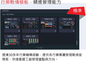 提煉30多年行業(yè)輔導經驗,提供各行業(yè)專屬管理戰(zhàn)情室模板,快速掌握工廠管理重點與方向。