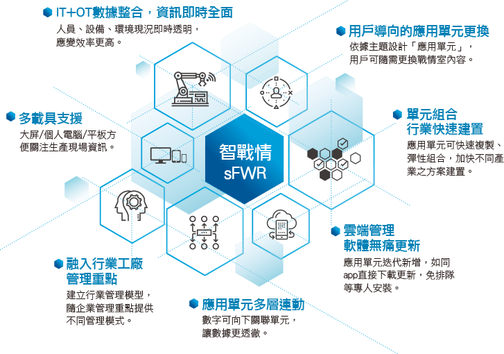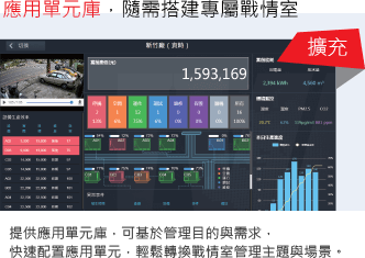 提供應用單元庫,可基於管理目的與需求,快速 配置應用單元,輕鬆轉換戰(zhàn)情室管理主題與場景。