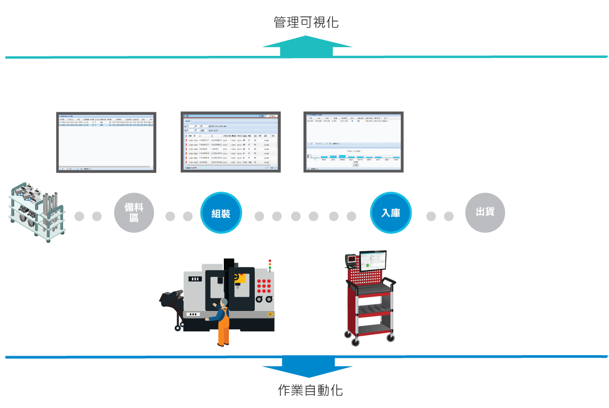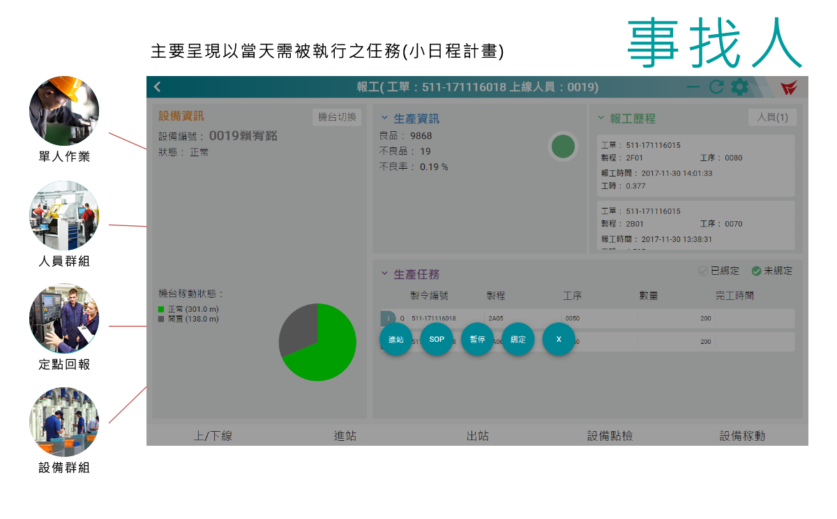 機(jī)械設(shè)備業(yè)現(xiàn)場(chǎng)進(jìn)度資訊收集,現(xiàn)況大都是以人員手寫資料,隔日收集的後補(bǔ)單模式。而在生產(chǎn)任務(wù)的指派也是透過紙本方式傳遞,「即時(shí)」這個(gè)想法都得有人力來支撐,事情一多落實(shí)性就備受考驗(yàn)。 現(xiàn)場(chǎng)資訊的即時(shí)連結(jié)是機(jī)械設(shè)備業(yè)不得不面對(duì)的挑戰(zhàn),以滿足面對(duì)客製化市場(chǎng)需求下,能即時(shí)進(jìn)行生產(chǎn)調(diào)度。