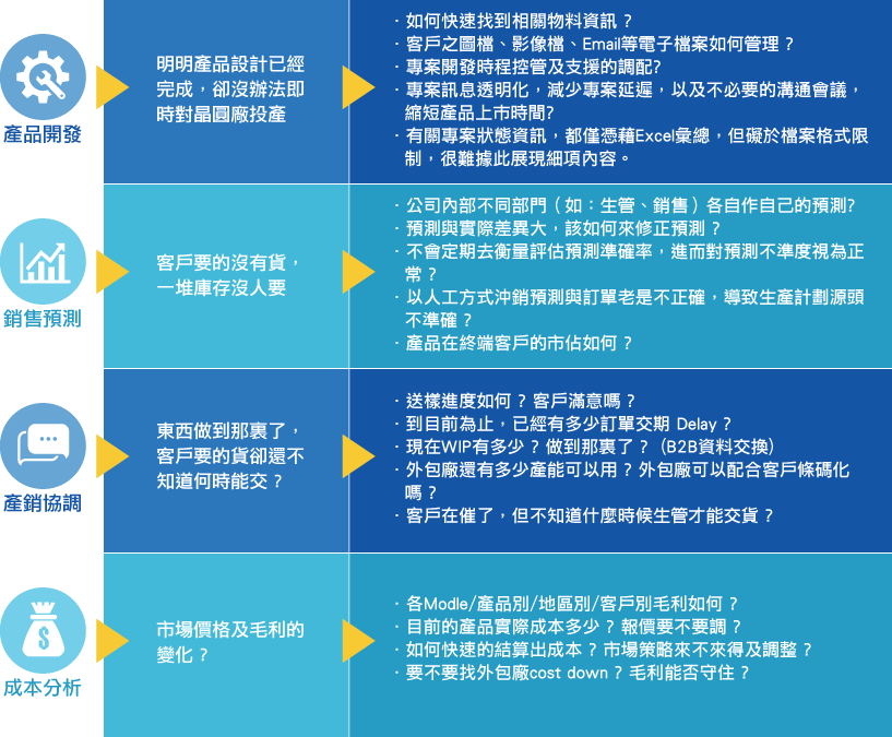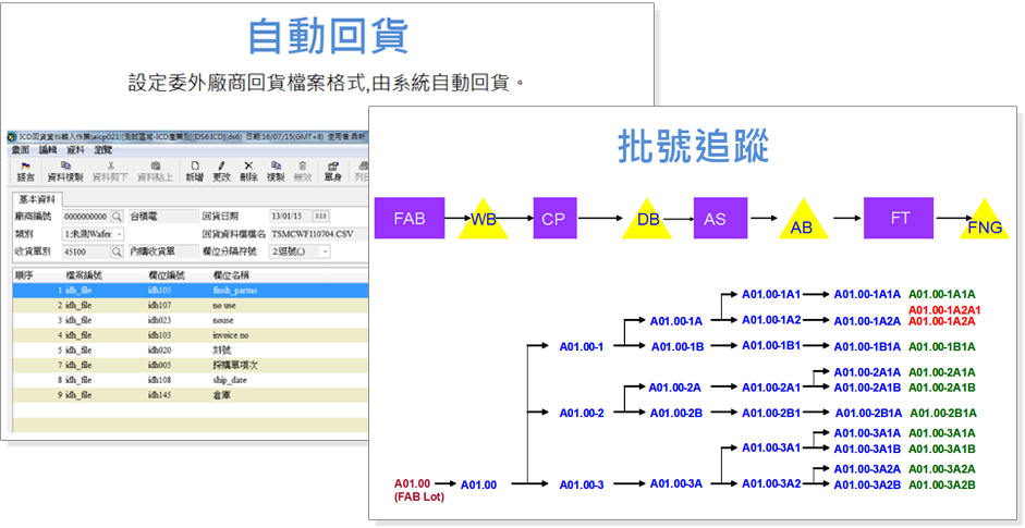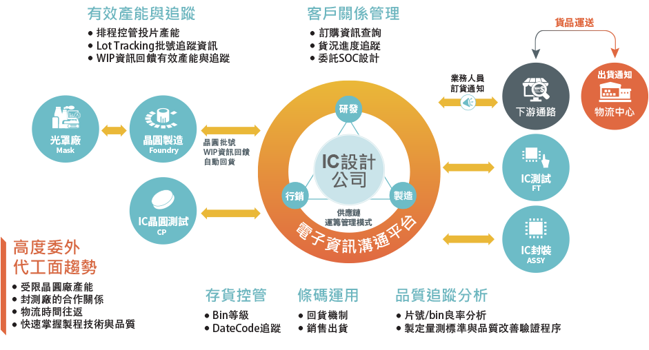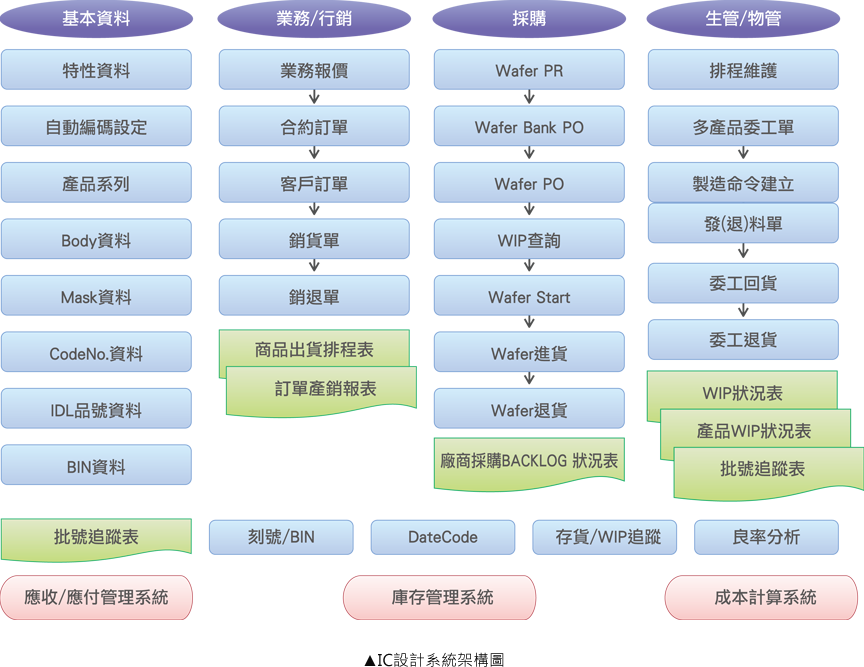 刻號(hào)/批號(hào)/Datecode/BIN管理,一直是IC設(shè)計(jì)業(yè)十分重要的管理議題,鼎新在IC設(shè)計(jì)產(chǎn)業(yè)超過150家的輔導(dǎo)經(jīng)驗(yàn),提供的方案除了業(yè)界最重視的外包回貨與外包進(jìn)度(WIP Status)、自動(dòng)發(fā)委外工單,也提供企業(yè)更精準(zhǔn)的成本分析,與各項(xiàng)銷售預(yù)測分析、專案管理,另外在虛擬工廠的即時(shí)管理與智慧排程方案,讓供應(yīng)鏈整合更加即時(shí)與智慧。