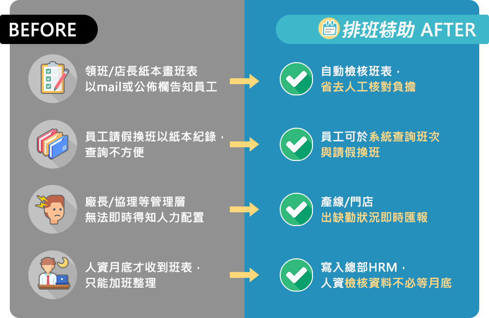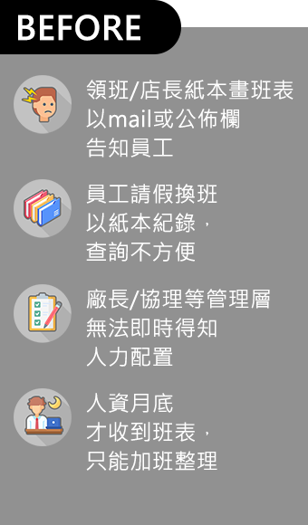 頻繁調(diào)換班,人資無法即時掌握班表,導(dǎo)致分店常因排班問題被勞檢罰款