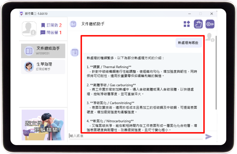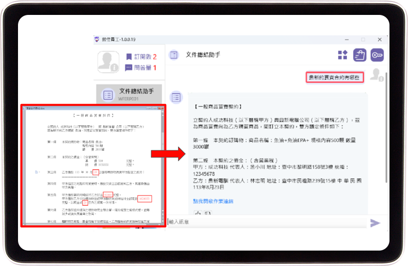 生成式AI問(wèn)答並延伸ERP附件功能,快速精煉摘要,完善知識(shí)封裝、協(xié)助文件稽核審閱。