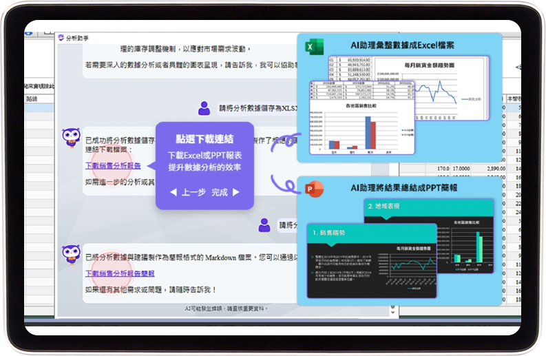 延伸現(xiàn)有ERP報(bào)表功能,讓AI進(jìn)行多維度分析,提取關(guān)鍵數(shù)據(jù),自動(dòng)產(chǎn)出圖表簡(jiǎn)報(bào)。