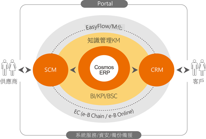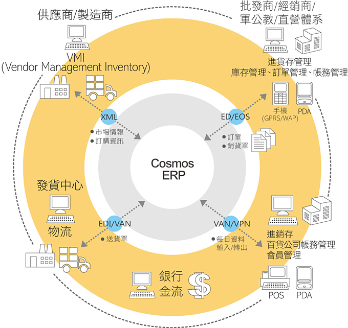 Cosmos ERP乃因應(yīng)21世紀(jì)買(mǎi)賣(mài)流通業(yè)商務(wù)洪流―快速變動(dòng)、無(wú)國(guó)界、微利所需的e化完整解決方案,整合流通經(jīng)營(yíng)體制,從上游加工廠商、國(guó)外供應(yīng)、境外公司到各地分公司、物流中心,一直到下游通路,從ERP到ERPII滿足企業(yè)對(duì)資訊及管理的需求,高度整合企業(yè)內(nèi)部流程,從客戶接單、存貨、採(cǎi)購(gòu)、生產(chǎn)到發(fā)貨等ㄧ連串作業(yè),提升企業(yè)內(nèi)部資訊的溝通與管理效能;Cosmos ERP的生產(chǎn)管理相關(guān)系統(tǒng)完整的解決方案 , 是以快速回應(yīng)和品質(zhì)管控為導(dǎo)向, 提昇買(mǎi)賣(mài)流通業(yè)從產(chǎn)品結(jié)構(gòu) 、製令託外、物料需求、製程、成本及品管保稅,一連串作業(yè)循環(huán)中資訊的整合與管理效能。