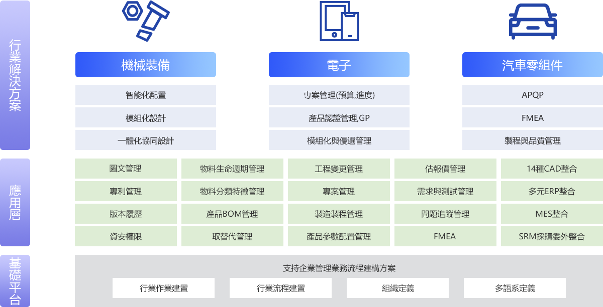 電子行業(yè)產(chǎn)品須符合不同國家法規(guī)與品質(zhì)要求,自動化生產(chǎn)普及率高,產(chǎn)品功能常須包含光、機(jī)、電等多研發(fā)領(lǐng)域,設(shè)計過程複雜度高,新品研發(fā)週期長,同業(yè)競爭對手多,電子材料規(guī)格複雜,特徵屬性管控不易,產(chǎn)品研發(fā)到上市週期包含研發(fā)成本管控一直是企業(yè)關(guān)注的管理重點。