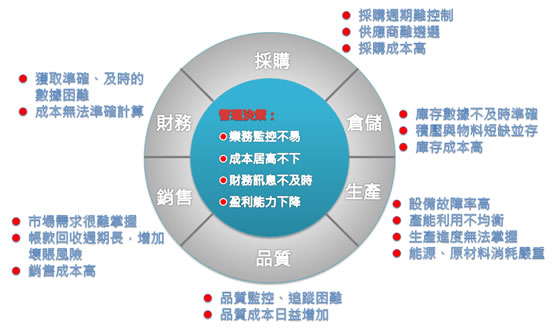 ◎銷售預測不準確 ?.客戶視原料價格趨勢下單。 ?.由於銷售狀況難以估計,對庫存量不易掌握。 ◎產(chǎn)品難以合理定價 ?.化工業(yè)的上下游關(guān)係受價格波動頗巨。 ?.如何訂價及有效管理庫存及需求的配比是一大問題。 |